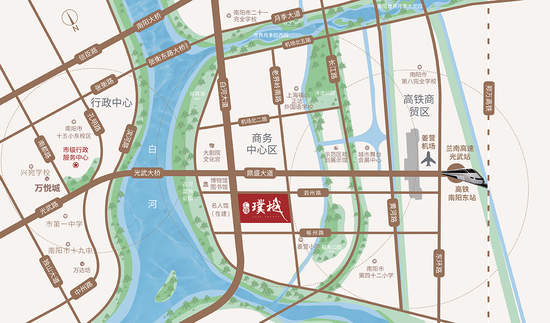 南阳外国语学校、姜营小学、第三十九小学等人文学府环伺,涵养名门韬略,通达万悦城、万达坊等商业,营造优渥生活主场