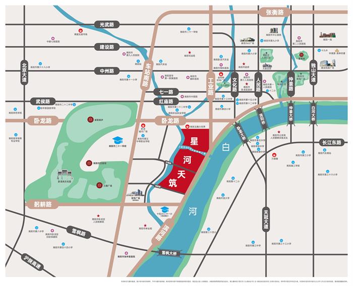 南阳武侯文化主题亲水沿线 白河、三里河、连通河三河环绕 、南阳卧龙医院、南阳市中医院、南阳市第一人民医院、张仲景医院、卧龙区妇幼保健院; 360/吾悦广场(规划建设)、金玛特时尚广场、大统百货、府衙步行街;